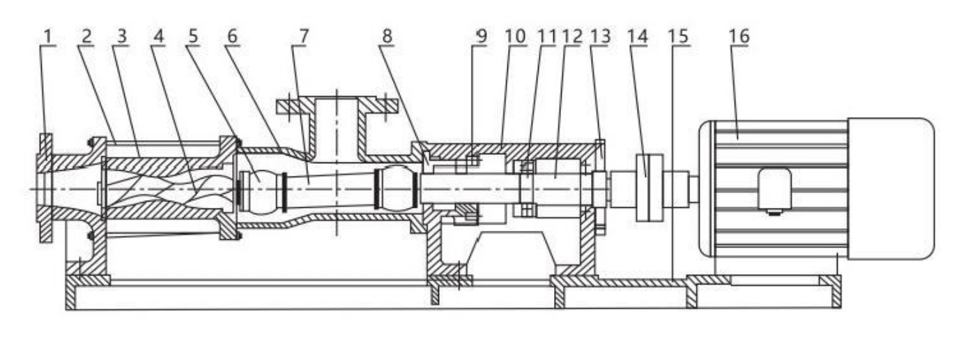 | Name | Discharge Body | Tie Rod | Stator | Screw Shaft | Feed Body | Connecting Shaft | Packing Seat | Bearing Seat | Bearing | Drive Shaft | Bearing Cover | Coupling | Base Plate | Motor |