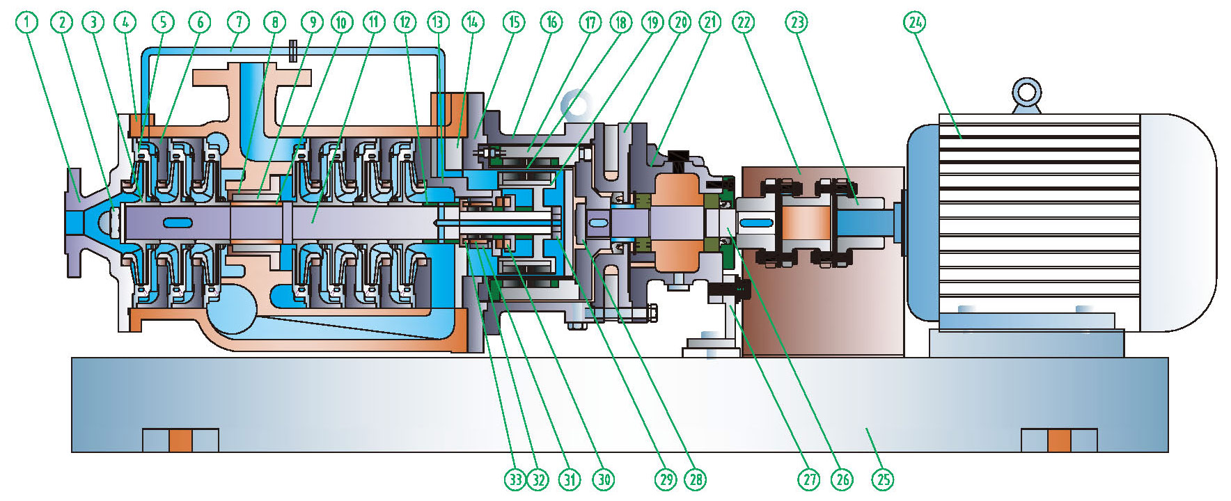 | ⑪ Pump shaft | 304/316/316L | ㉒ Shield | 202 | ㉝ Front thrust collar | SSIC/hard alloy |